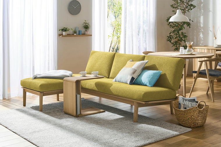 肘クッションで使い方が広がるシンプルでコンパクトなソファ。