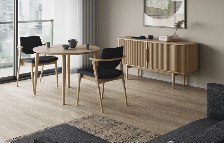 天板表面は、角の取れたデザインで滑らかな手触り感に仕上げ、存在感がありつつも圧迫感は感じさせません。また、細身の脚は床が見えてお部屋を広く感じさせてくれます。
